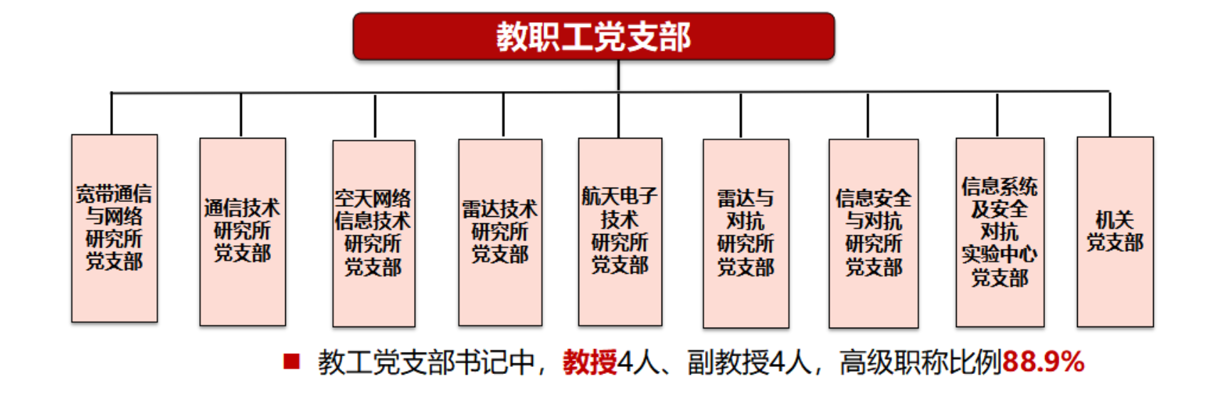 2019年,学院党委获批教育部第二批“全国党建标杆院系”建设称号,雷达技术研究所党支部获批“全国党建样板支部”建设称号。学院空天网络信息技术研究所党支部、机关党支部、研究生雷达第七党支部、研究生通信第一党支部、研究生对抗第三党支部获批学校样板支部称号。
