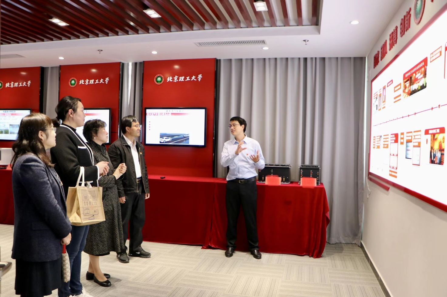 在参观环节,雷达技术研究所副所长刘泉华教授带领部分党员代表参观了雷达技术研究所成果展,介绍了雷达所的发展历程,讲述了团队在毛二可院士的带领下,以“国家、团队、拼搏、创新、严格、用心、专业、节约”为精神内核在科研上取得的一系列成就。