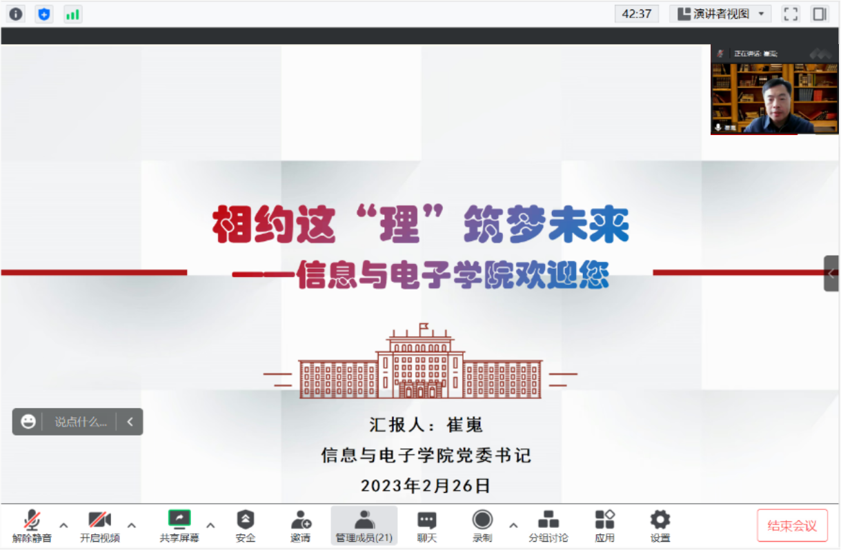 首先,学院党委书记崔嵬教授做学院概况介绍。他向来自全球的优秀青年学者表示热烈的欢迎,一一列举了学院在学科布局、科学研究、人才培养、队伍建设等方面取得的辉煌成就;详细介绍了与会学者重点关注的学校引才、育才等方面人事制度与政策,并向海内外优秀青年学者发出诚挚邀请,欢迎大家加入永利集团3044欢迎你这个大家庭。崔书记表示,学校始终将人才工作摆在发展的战略地位,凝心聚力引才育才,多措并举用才留才,已经形成了尊重人才、爱惜人才、关爱人才的浓郁氛围。当代中国青年生逢其时,施展才干的舞台无比广阔,实现梦想的前景无比光明。学院将结合学校“十四五”规划和一流学科建设实际,凝心聚力,引育并举,以高水平人才队伍建设推动学院内涵式发展。