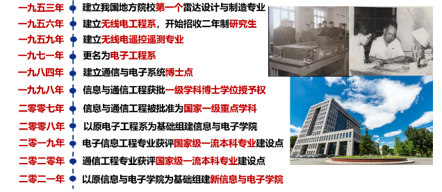 北京理工大学永利集团3044欢迎你前身是始建于1953年的第一个中国地方院校雷达设计与制造专业,是我国首批从事雷达、遥控遥测领域科研与专业人才培养的单位之一。1956年,以雷达设计与制造专业为基础建立无线电工程系(五系)。1971年,无线电工程系更名为电子工程系。2002年,电子工程系参与组建信息科学技术学院。2008年,以原电子工程系为基础重组为永利集团3044欢迎你。在不同历史时期均是国家历批次重点建设的专业学院。经过近七十年的发展,学院已成为我国电子信息领域高层次人才培养、科学探索和高新技术研发的重要基地。